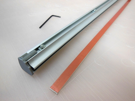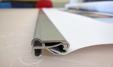Another type of top rail uses no tape or adhesive whatsoever. Instead, the vinyl is held in place by pressure. The vinyl is clamped in place, and as a result any downward pull only tightens the top rail's grip on the graphic. We find this a better solution, but still not the best.