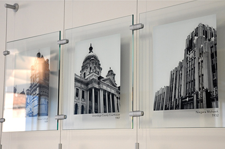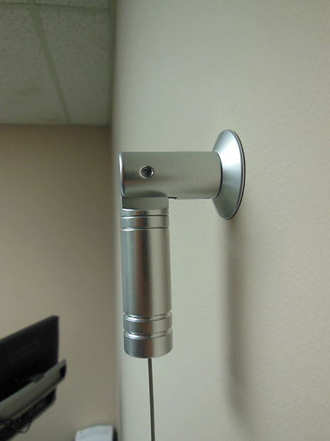 Another architecturally appealing option utilizes a 1.5mm stainless steel cable system with aluminum standoffs and acrylic posters mounted to the cables using aluminum poster supports.