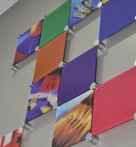 There's a plethora of other creative options that can be used when designing your inner office signs utilizing acrylic. Several aluminum stand-off options are available that allow your acrylic posters to anchored on the outside corners, on the inside corner through a drilled hole or between two adjoining acrylic panels. Here's a few inspirational images....
