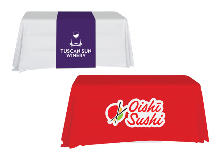 We offer both table covers and table runners. Covers come in 4’, 6’, or 8’ sizes. Some hang loose, but we also offer both fitted and stretch fabric covers as well. Table runners that range between 24” and 60” wide.